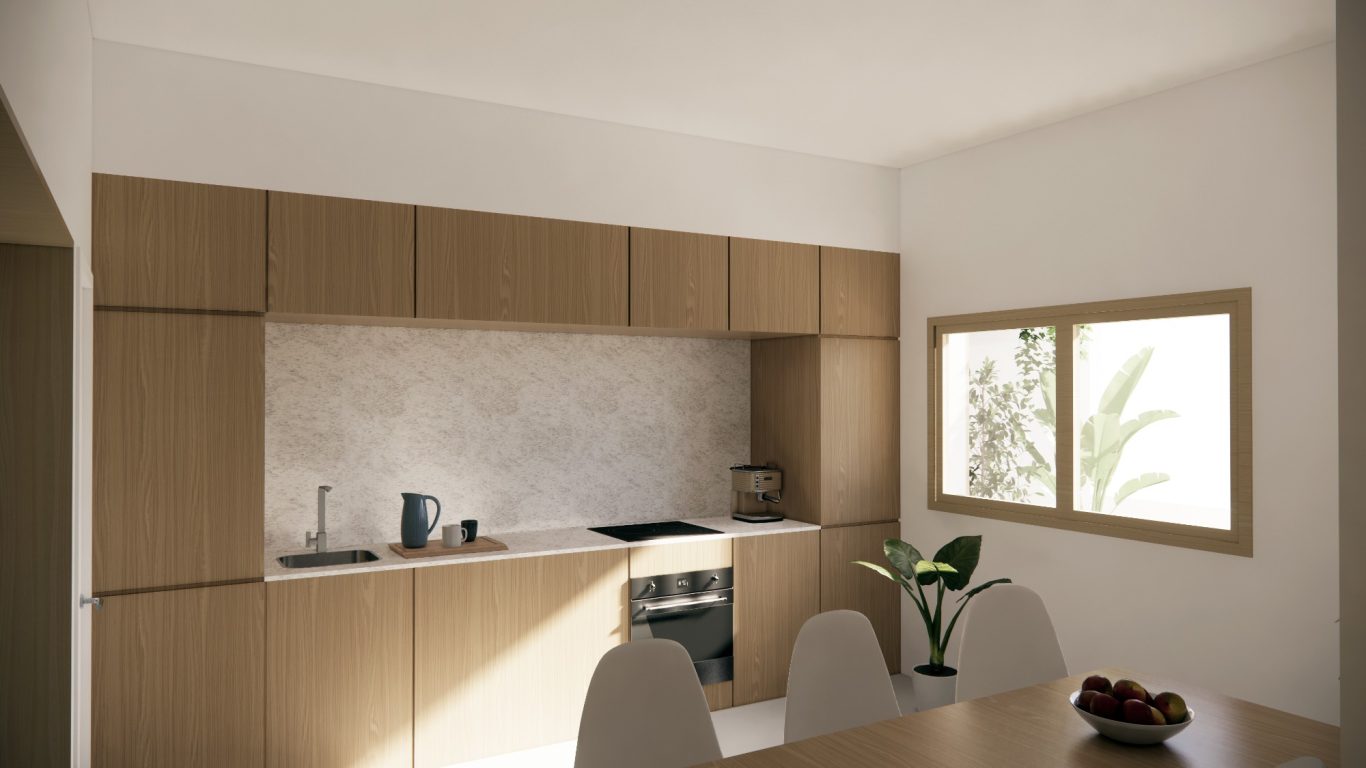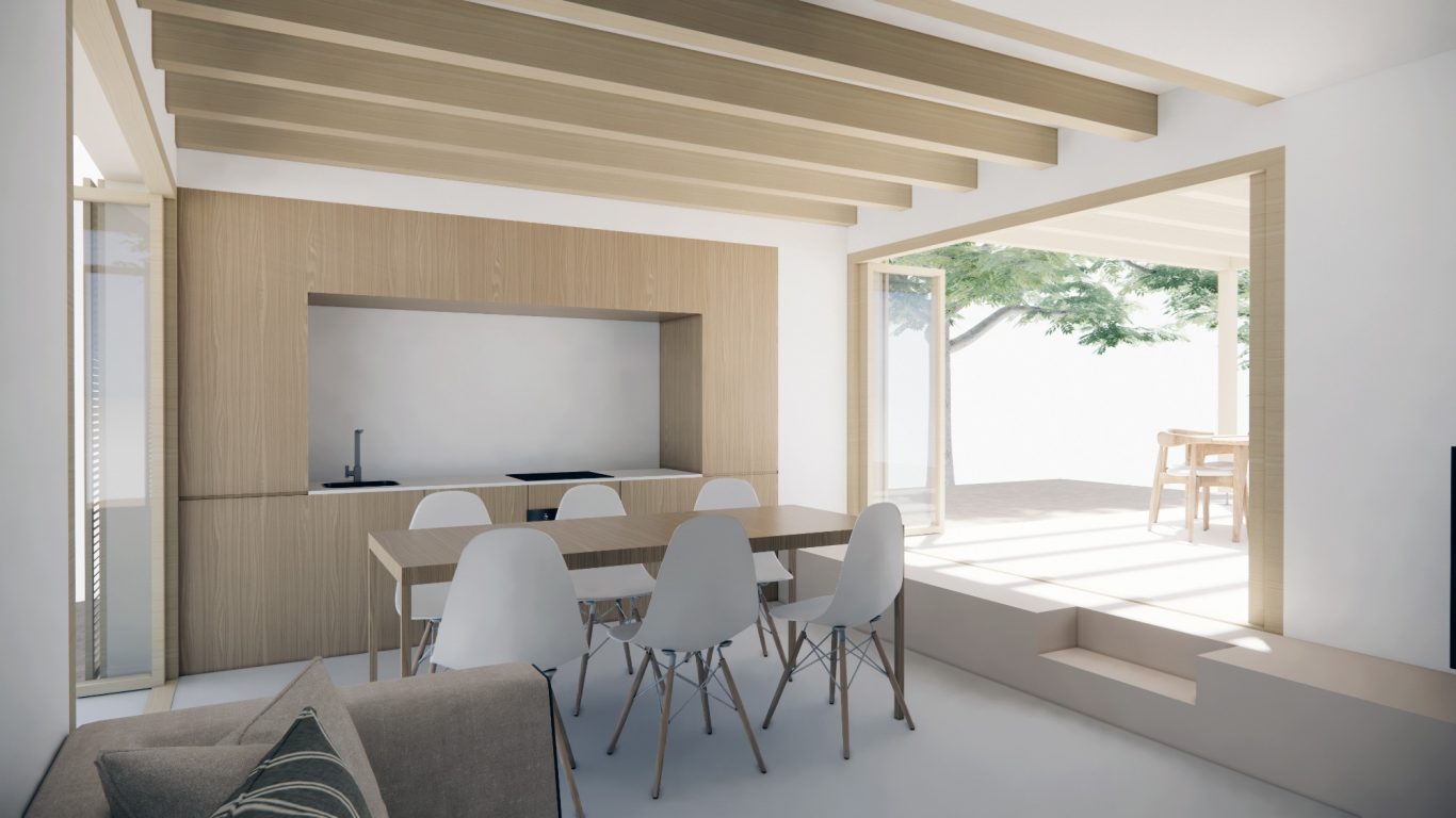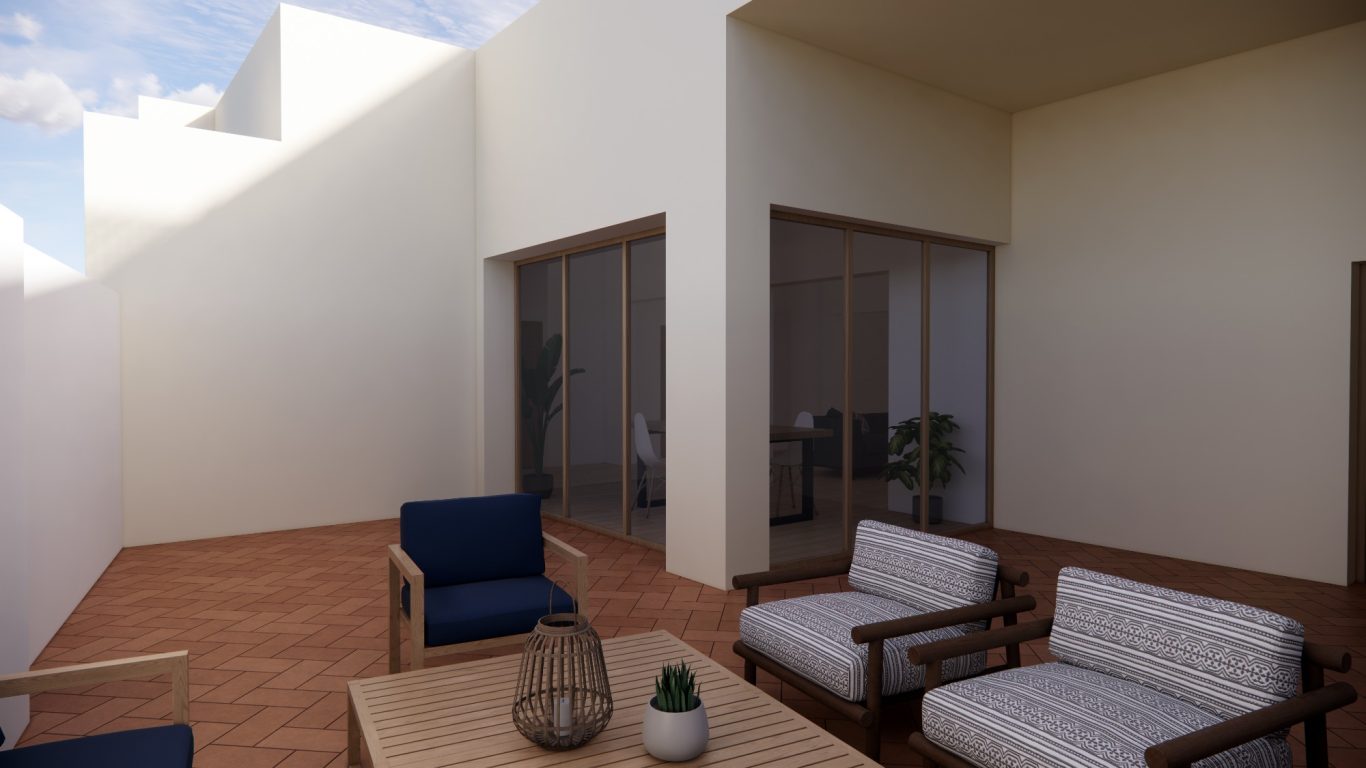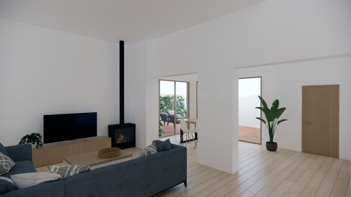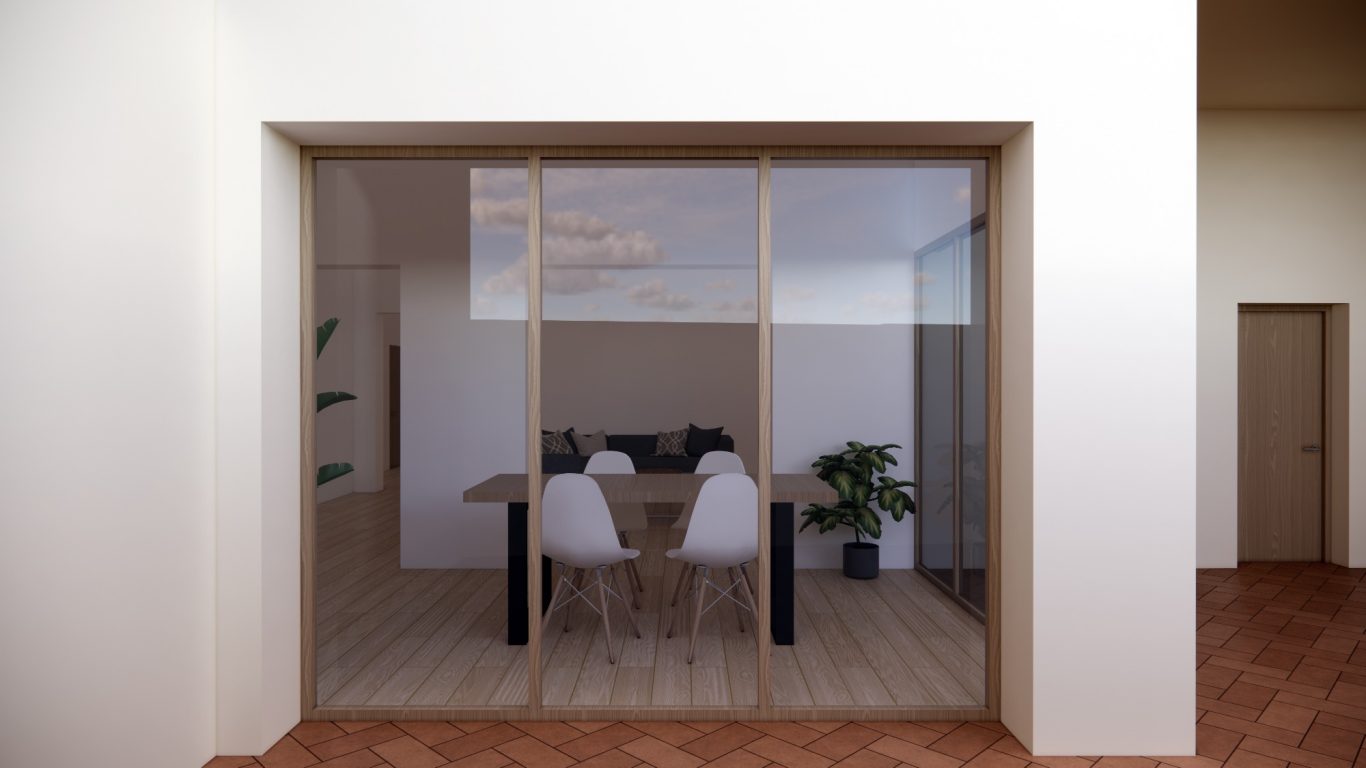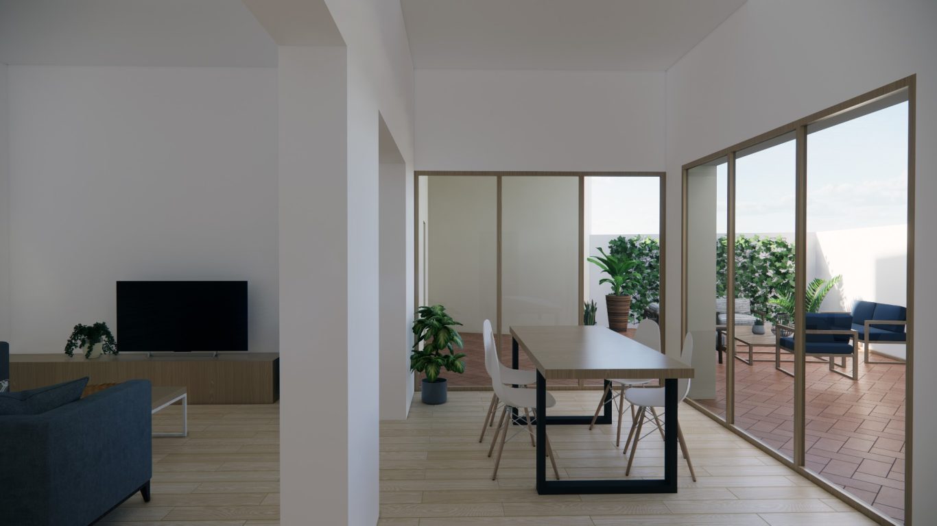 La reforma de esta vivienda comienza derribando parte de la sala con el objetivo de tener un patio más grande y una mejor relación entre el espacio interior y el exterior. La nueva distribución resitua la sala en la zona más oscura y el comedor en la más luminosa y próxima a la cocina. También se mejora la eficiencia energética de la vivienda con aislamiento térmico en las fachadas y cubiertas, unas carpinterías con vidrios bajo emisivos y la instalación de placas fotovoltaicas en la cubierta inclinada.