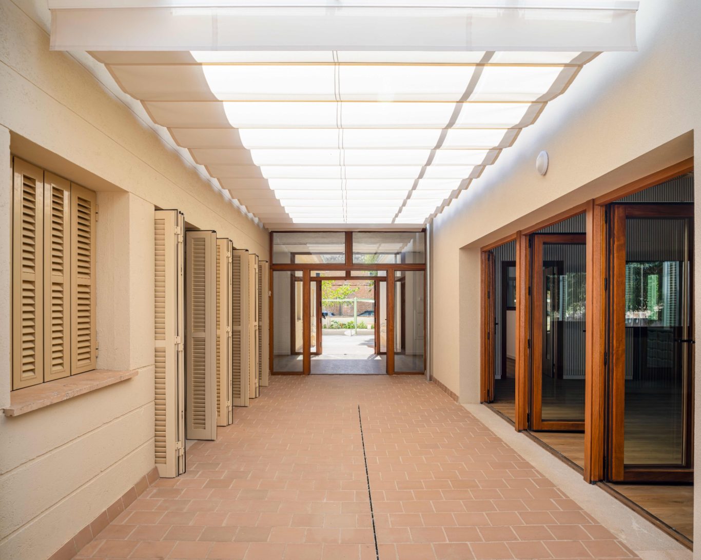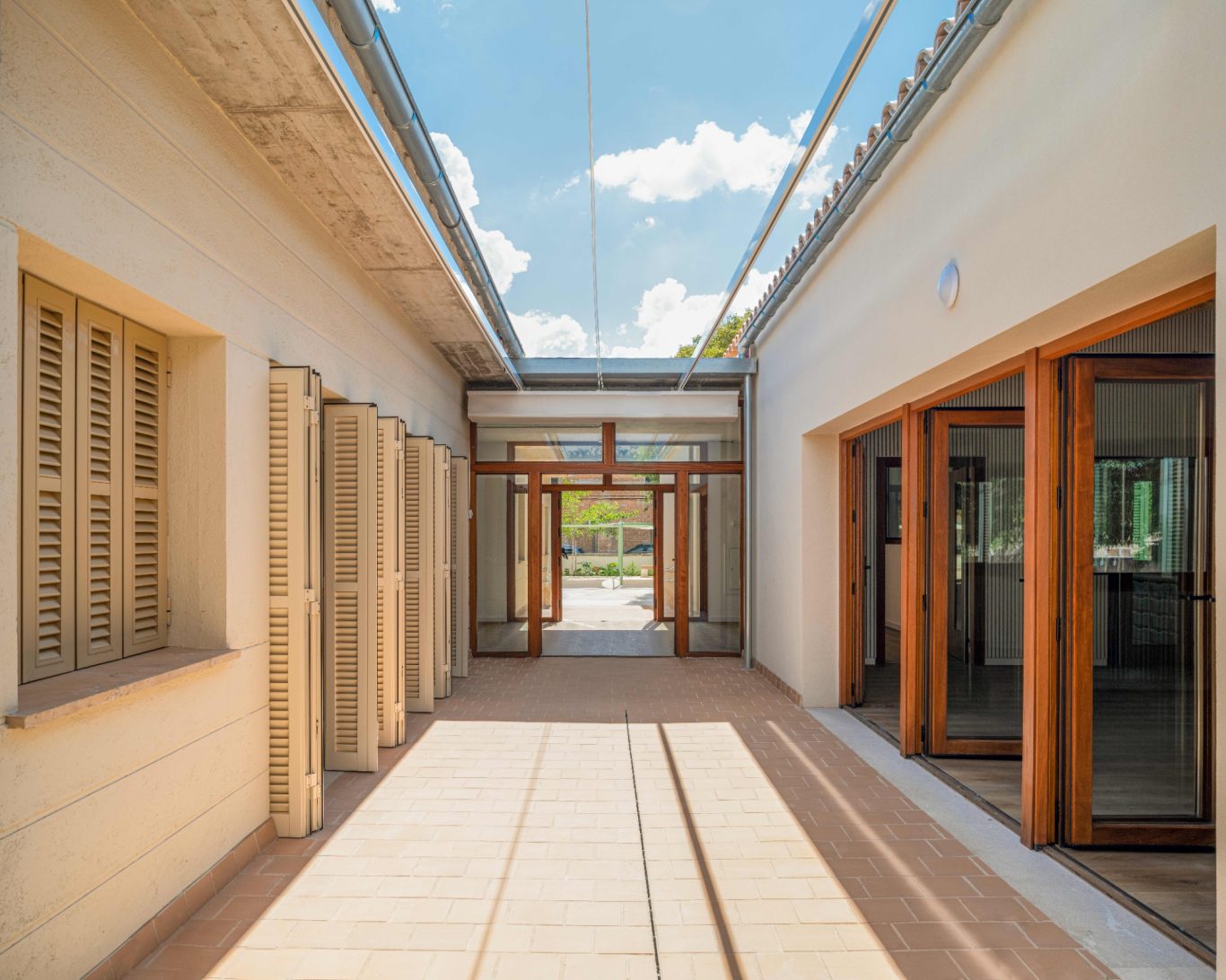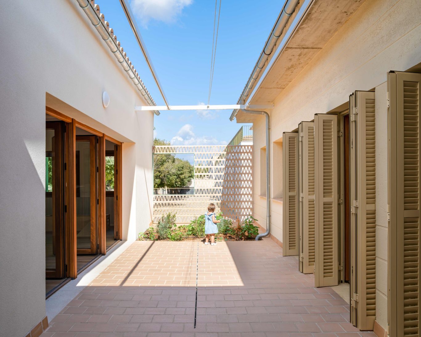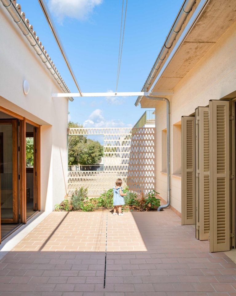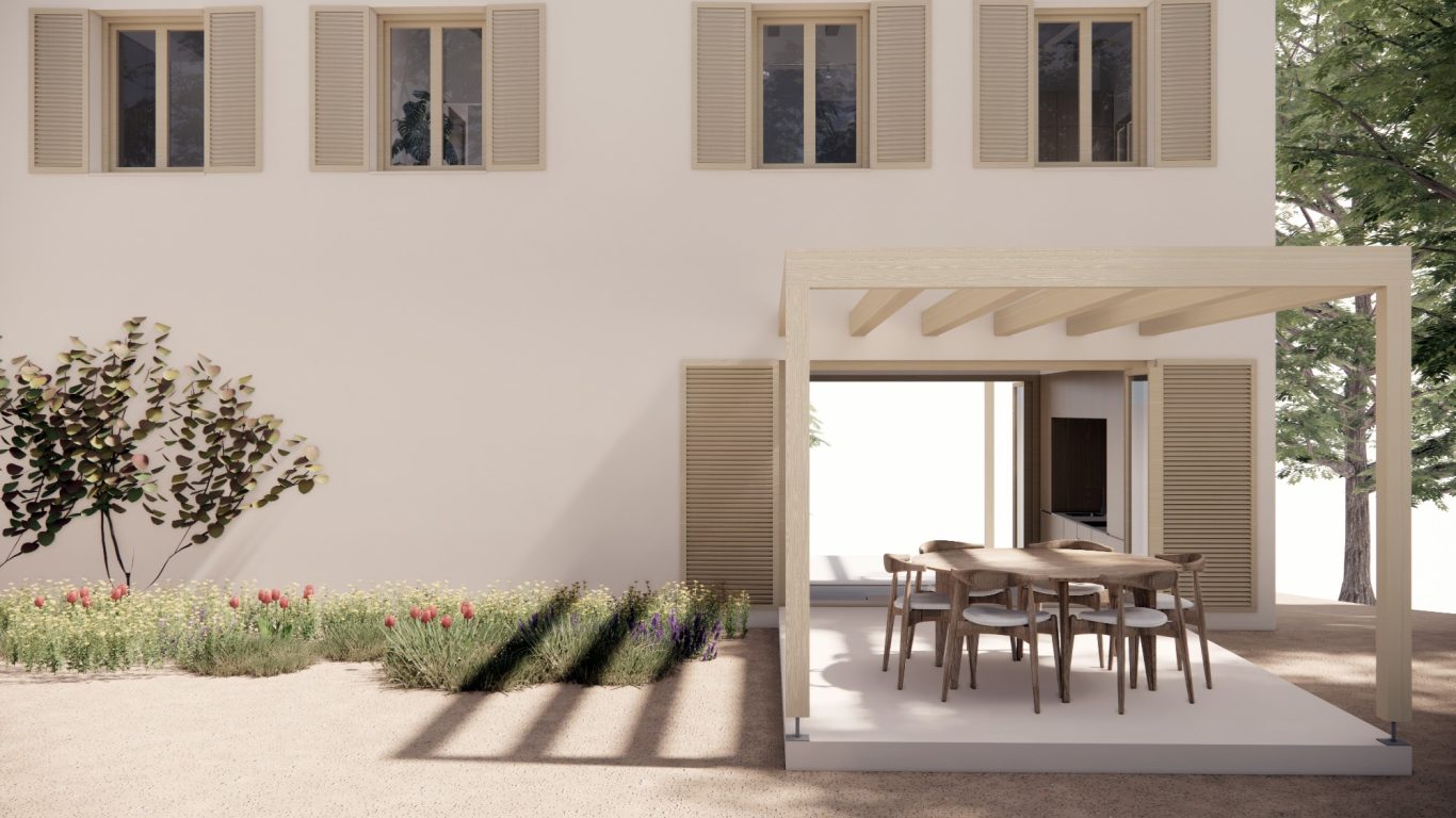 La reforma de esta vivienda comienza derribando parte de la sala con el objetivo de tener un patio más grande y una mejor relación entre el espacio interior y el exterior. La nueva distribución resitua la sala en la zona más oscura y el comedor en la más luminosa y próxima a la cocina. También se mejora la eficiencia energética de la vivienda con aislamiento térmico en las fachadas y cubiertas, unas carpinterías con vidrios bajo emisivos y la instalación de placas fotovoltaicas en la cubierta inclinada.