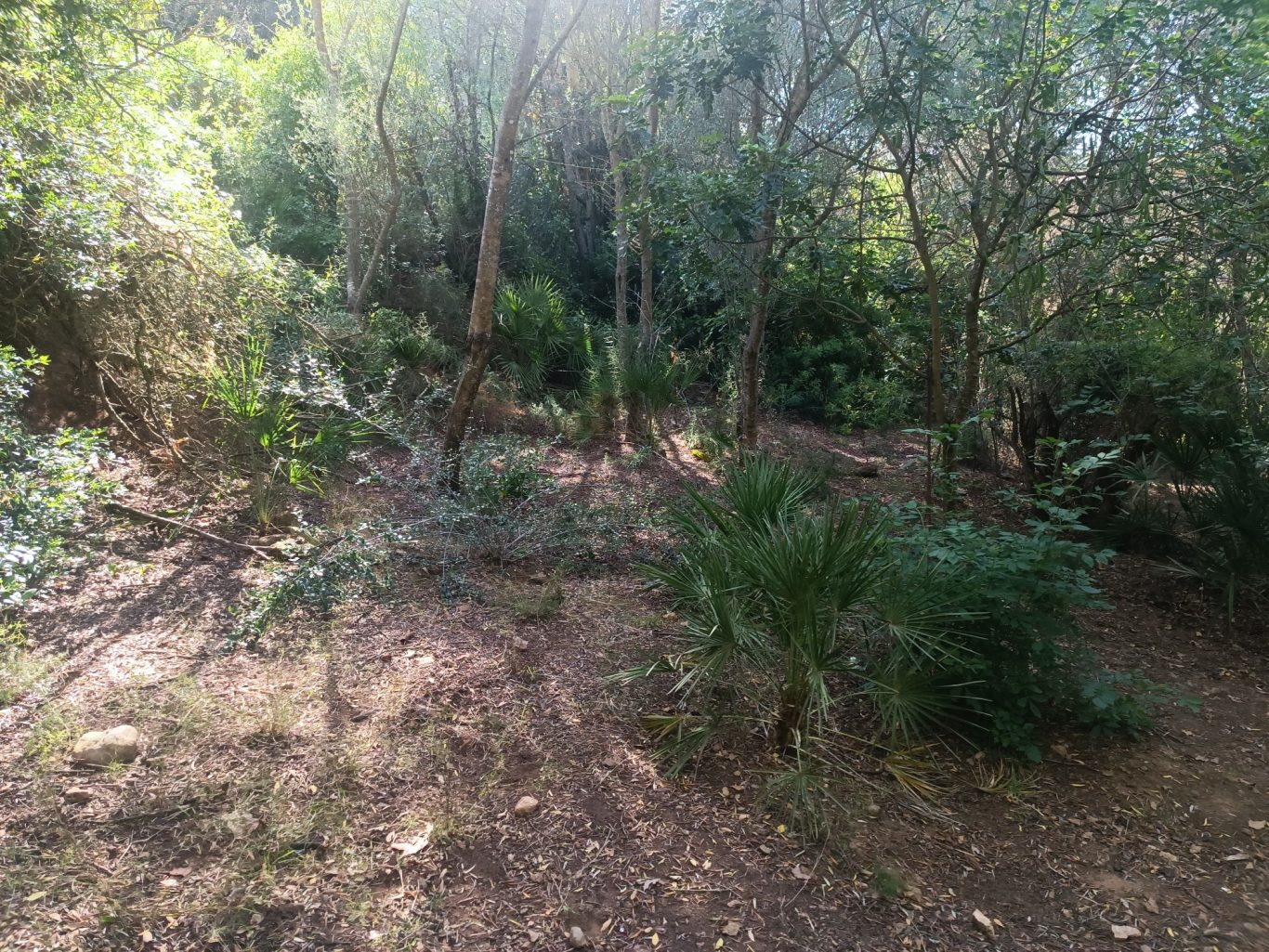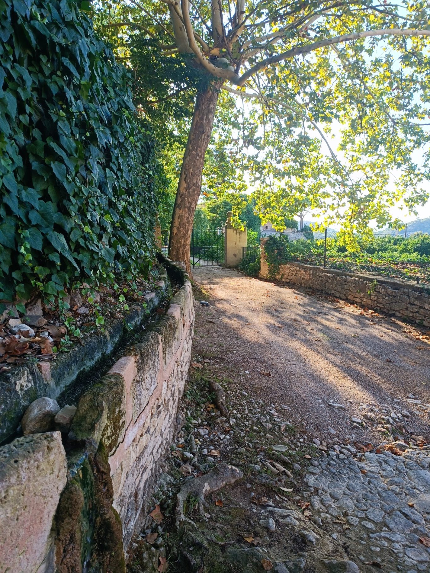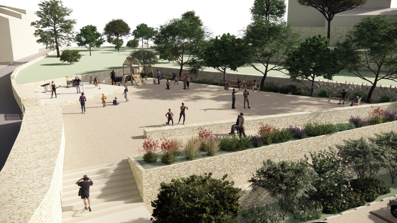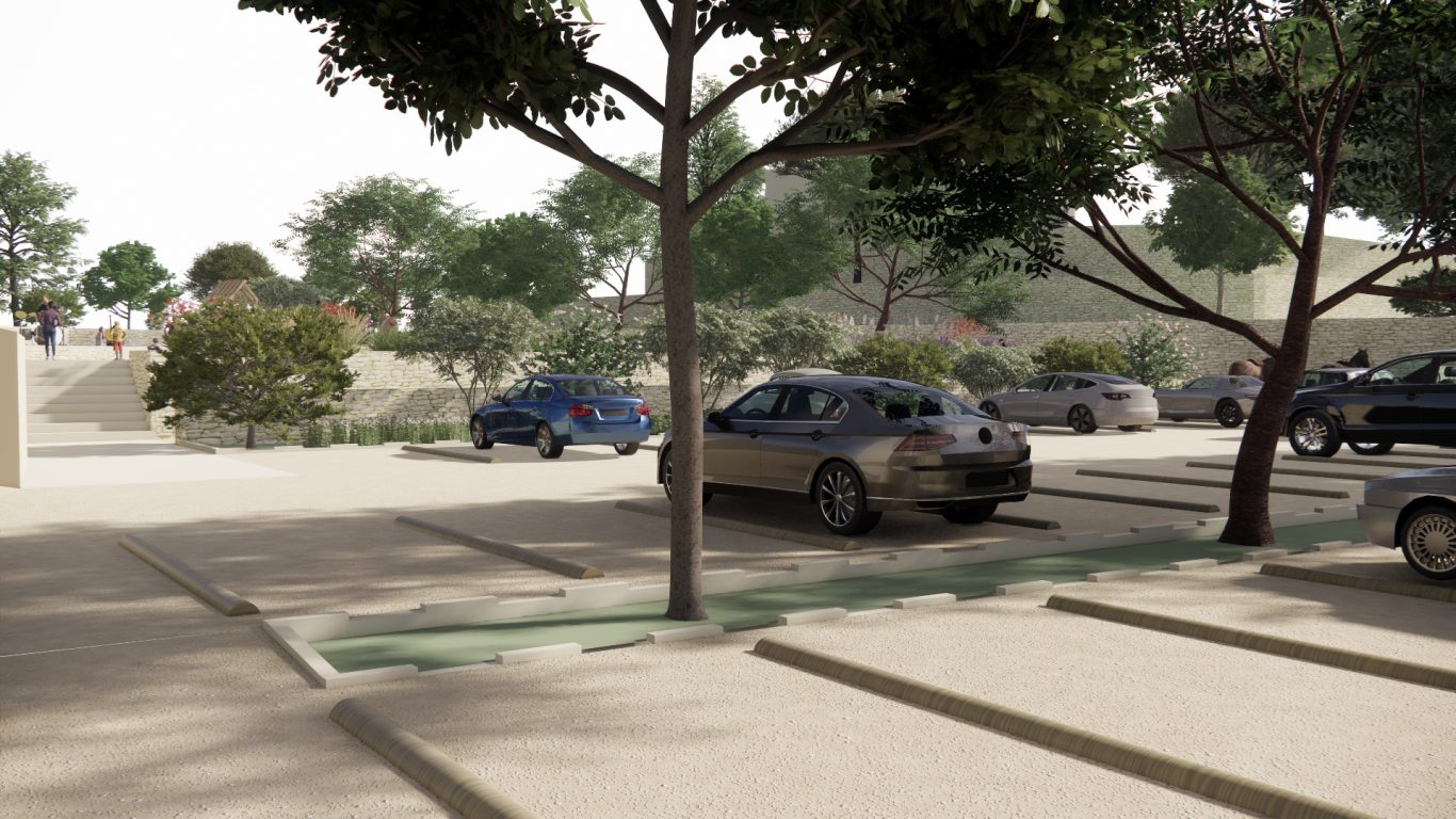 Se mejora la accesibilidad y la comunicación del espacio público de Son Romeguera entre la zona situada en la cota inferior (aparcamiento) y la copa superior (la plaza). Para ello se construye una escalera que genera un paso directo y se cambia el pavimento de la rampa por uno de tierra compactada estabilizada. También se aprovecha para recuperar el jardín de la rampa plantando vegetación de bajo consumo hídrico que además se regará por gravedad con el agua del aljibe de la plaza.