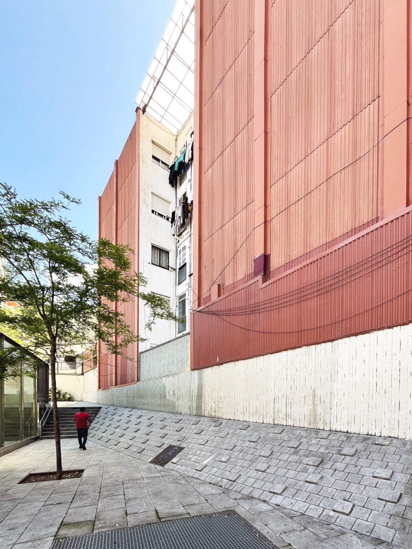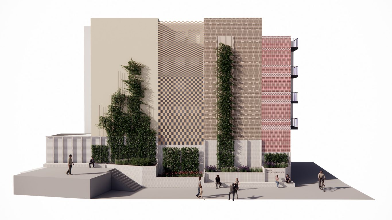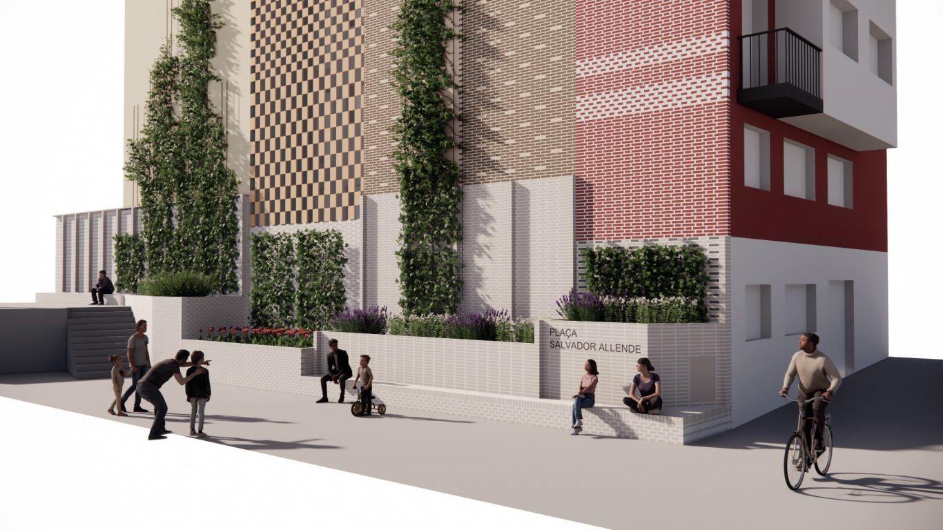 A partir de obtener el primer permio en el V Concurso de Intervenció sobre Paredes Medianeras de BCN, se desarrolla el proyecto para materializar una nueva fachada en la plaza Salvador Allende. La propuesta tiene la voluntad de integrarse en el tejido de la zona, fragmentando la medianera en 4, imitando el parcelario cercano y utilizando materiales cerámicos. Se pone especial atención en crear un encuentro amable entre el plano vertical i el espacio público con bancos y vegetación.