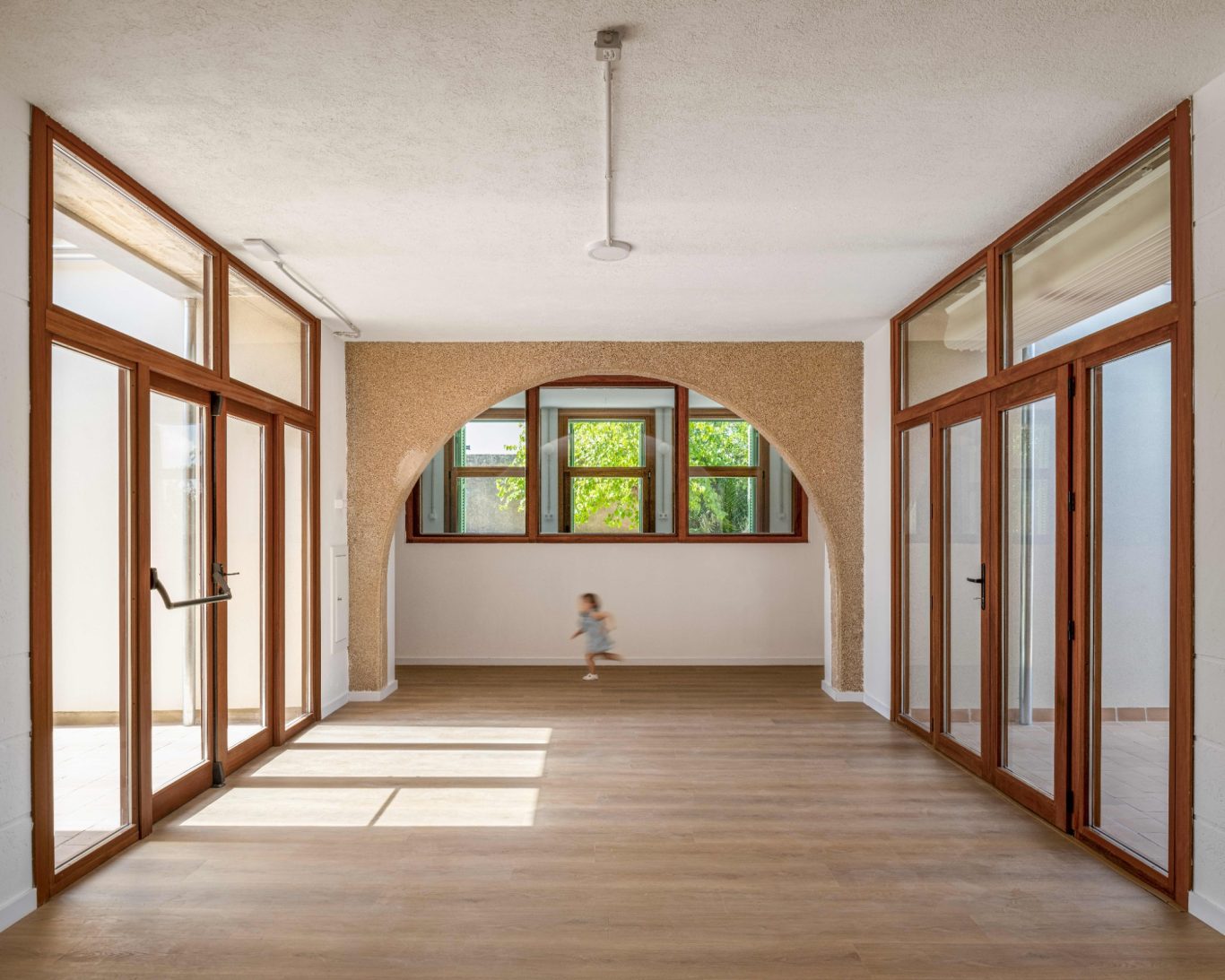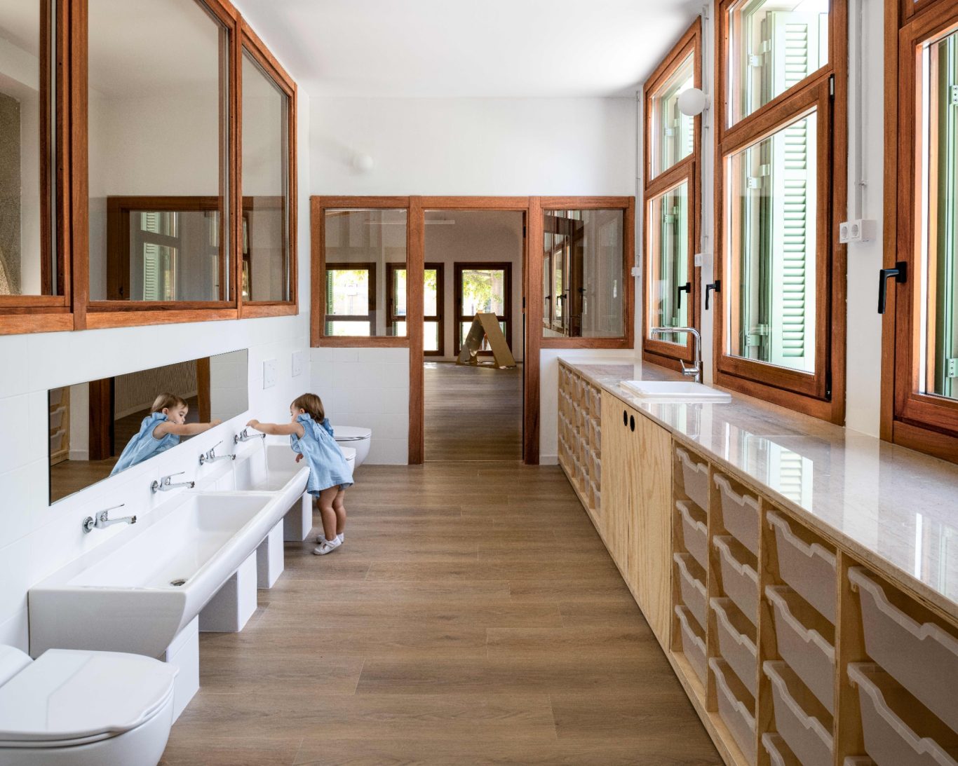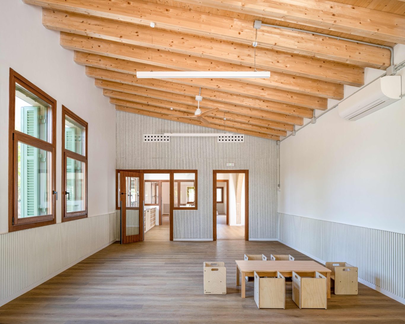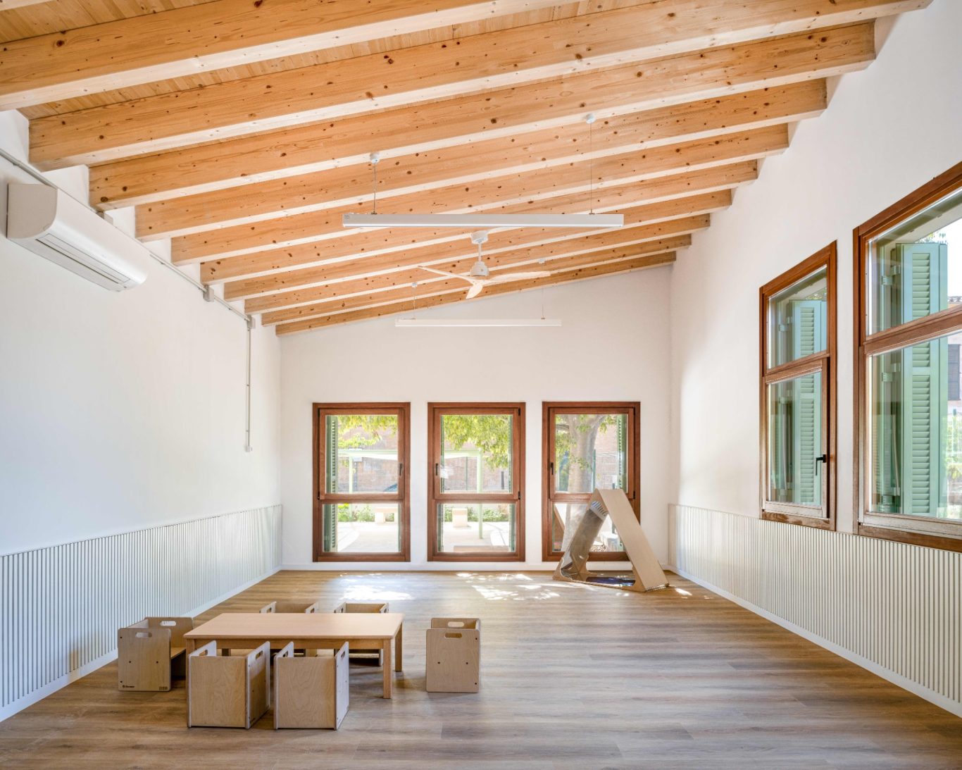 La ampliación dota a la guardería de dos aulas más, un baño compartido entre las dos, un espacio comunitario con iluminació natural, un patio para los bebés y una rampa accesbile. El proyecto trata de prolongar el edifcio existente formalizando un volum simple con cubierta inclinada, respetando la cota del pavimento interior existente, manteniendo el zócola y la proporción de las aberturas. De la mano del equipo directivo, los espacio interiores se diseñan con el fin de dar respuesta a la filosofía educativa del centro. Los espacio son abiertos, transparentes, flexibles y se relaciones entre ellos. De esta forma se impulsa la autonomía y el aprendizaje de los niños a travé sdel juego y del descubrimiento. El edifico se ha proyectado para consumir la mínima energía, conseguir el mejor confort térmico energético y para garantizar una calidad del aire excelente.