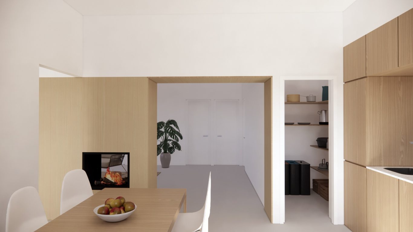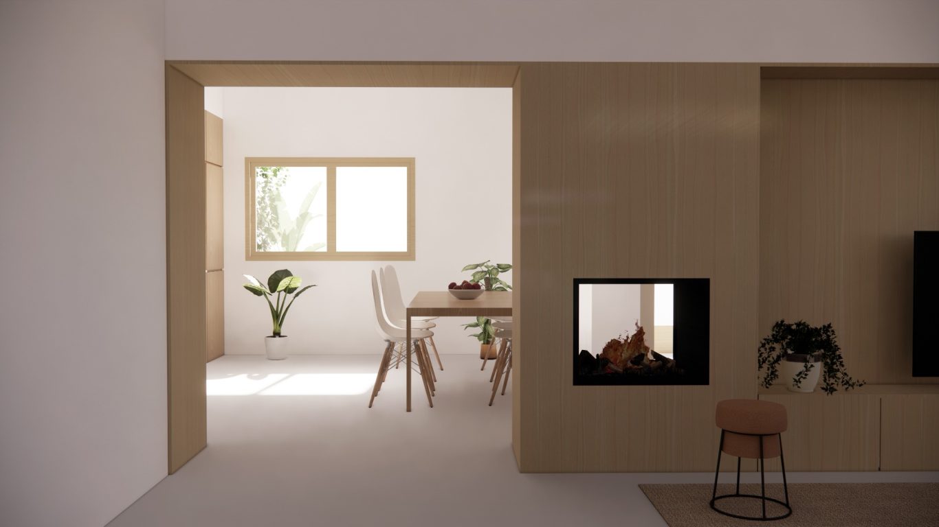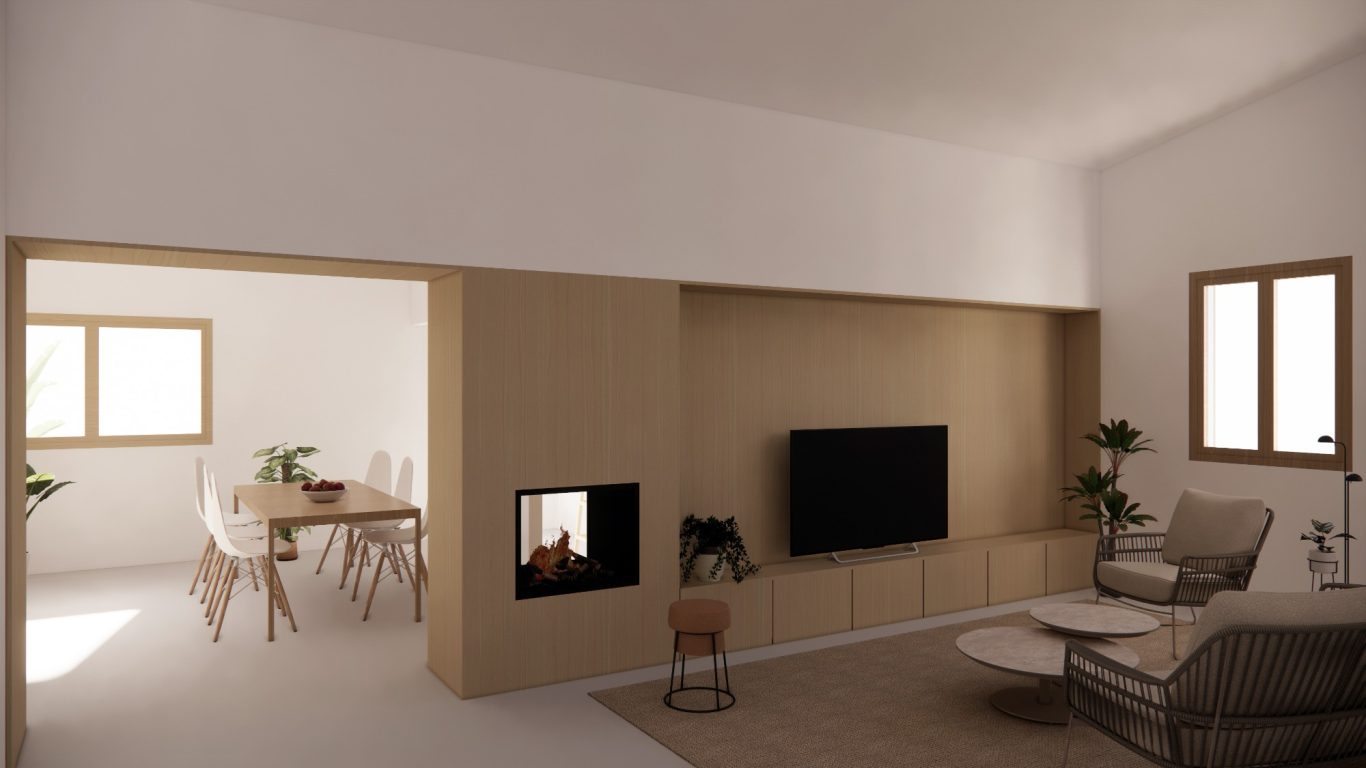 Se reforma la vivienda existente ordenando el programa a lo largo de tres crujías y manteniendo la ventilación natural cruzada. La crujía orientada al sur y la central albergan los espacios comunes, mienstras que en la crujia del norte se colocan los espacios más privados. Todos los dormitorios tienen la misma dimensión para flexibilizar las necesidades de sus ocupantes. En el centro de la zona común se instala una chimenea que se puede disfrutar tanto de la sala como de la cocina - comedor.