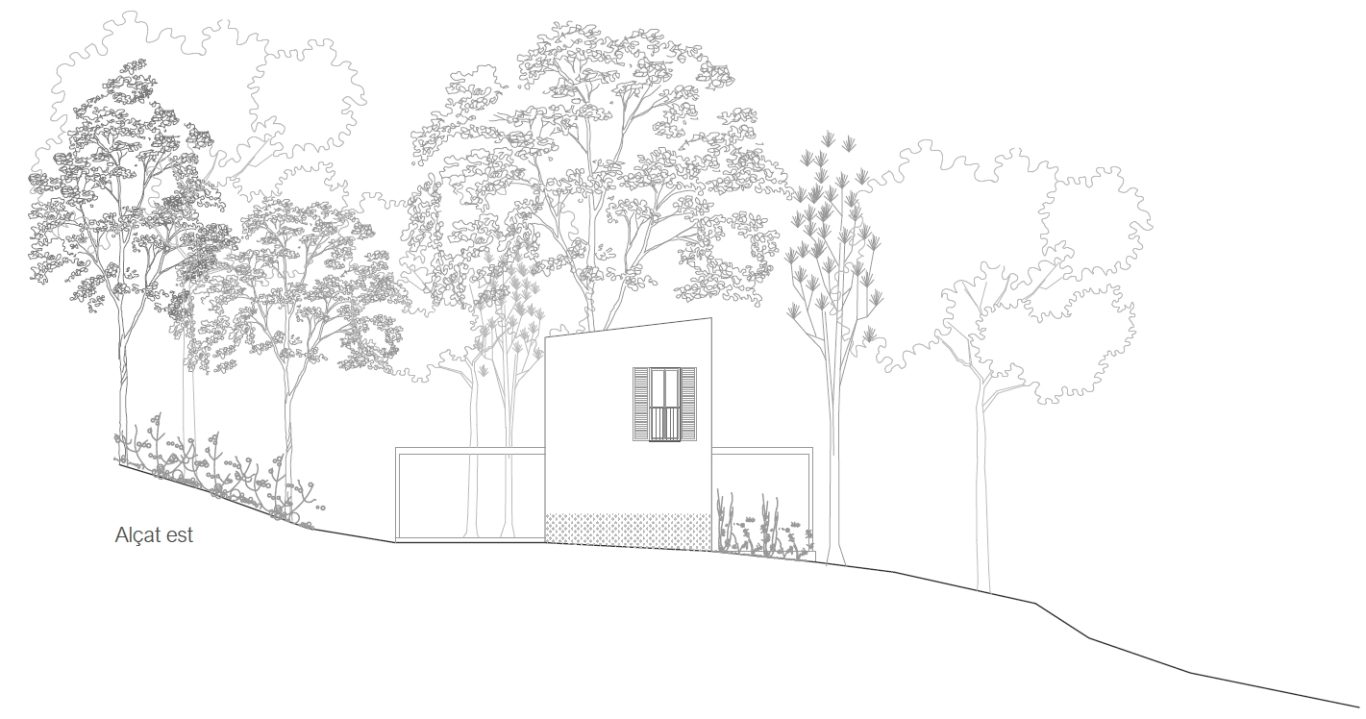 Aquest habitatge unifamiliar d'obra nova té unes mides ajustades d'acord amb la normativa urbanística. Per això es treballa l'aprofitament de l'espai i la percepció que l'habitatge molt més enllà de l'interior dels seus murs, entenent el bosc com una extensió de l'espai interior. A la planta baixa es treballa amb un espai únic que disposa d'una pèrgola al nord i un altre al sud. A la planta primera se situen els dormitoris i un espai comú que es podrà adaptar als requisits del moment.