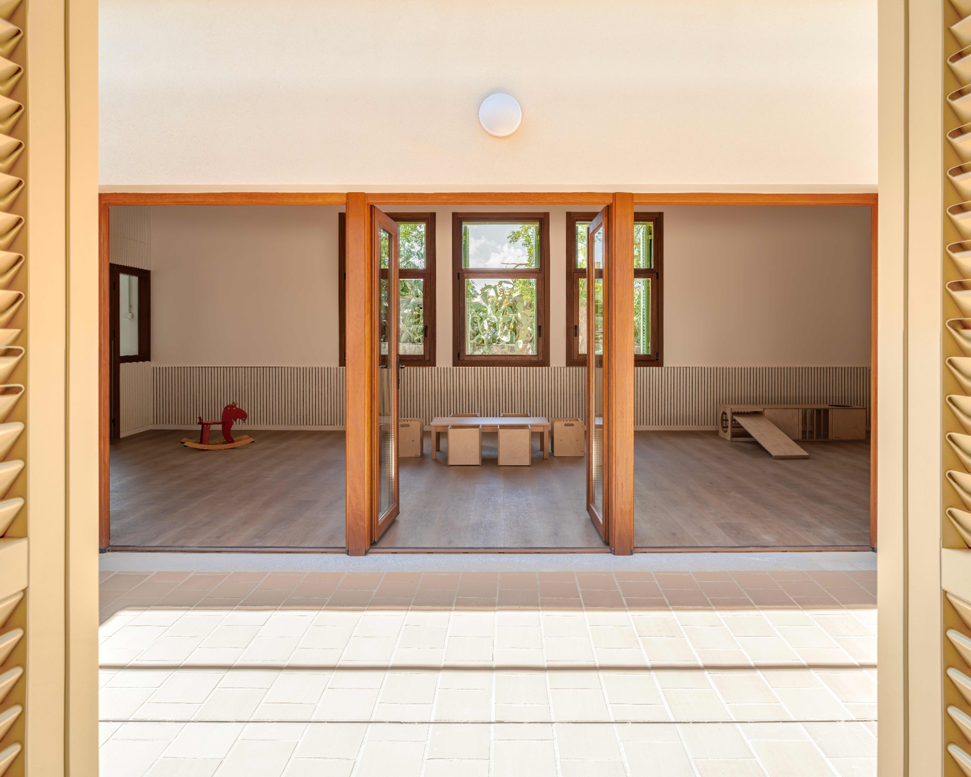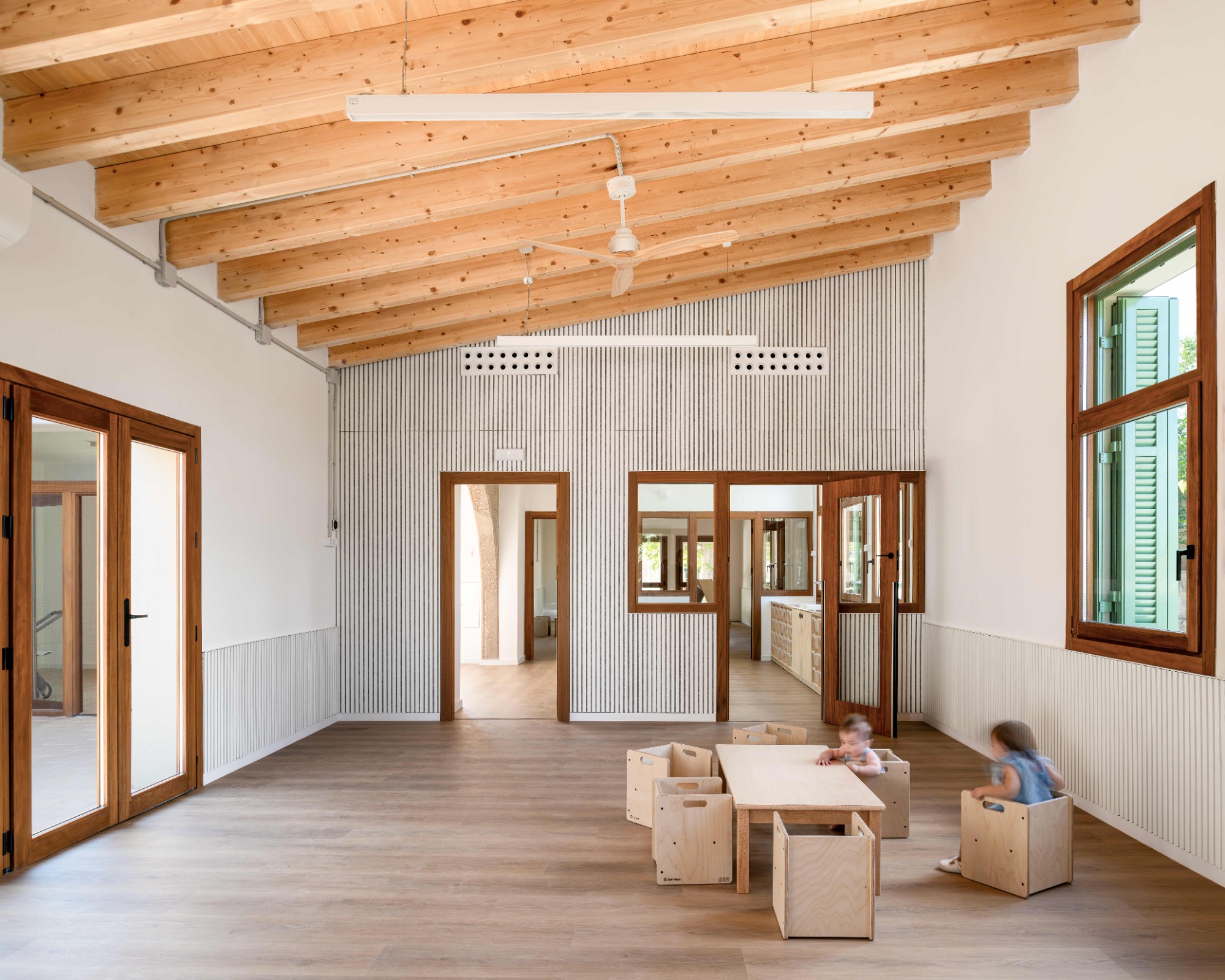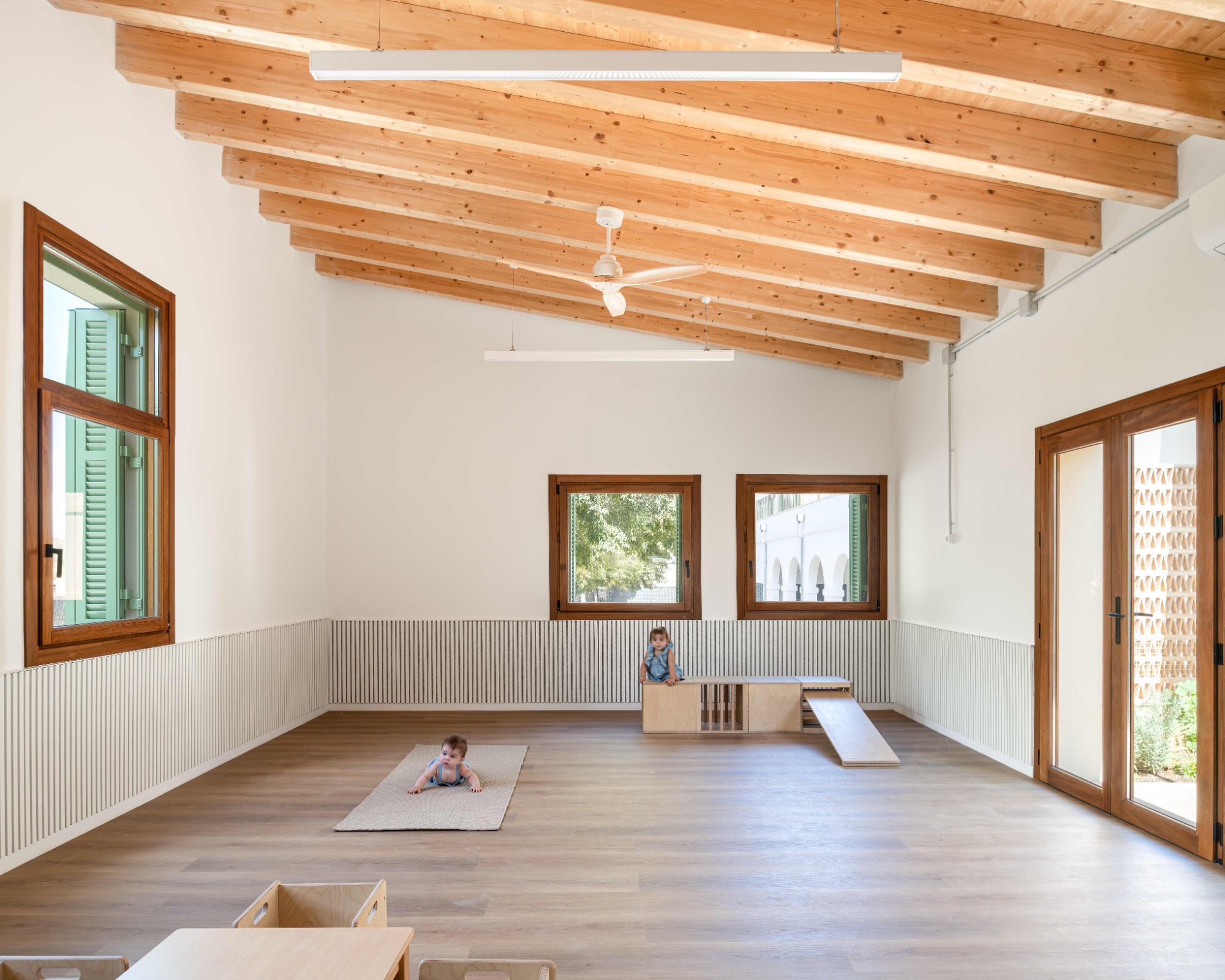 La ampliación dota a la guardería de dos aulas más, un baño compartido entre las dos, un espacio comunitario con iluminació natural, un patio para los bebés y una rampa accesbile. El proyecto trata de prolongar el edifcio existente formalizando un volum simple con cubierta inclinada, respetando la cota del pavimento interior existente, manteniendo el zócola y la proporción de las aberturas. De la mano del equipo directivo, los espacio interiores se diseñan con el fin de dar respuesta a la filosofía educativa del centro. Los espacio son abiertos, transparentes, flexibles y se relaciones entre ellos. De esta forma se impulsa la autonomía y el aprendizaje de los niños a travé sdel juego y del descubrimiento. El edifico se ha proyectado para consumir la mínima energía, conseguir el mejor confort térmico energético y para garantizar una calidad del aire excelente.